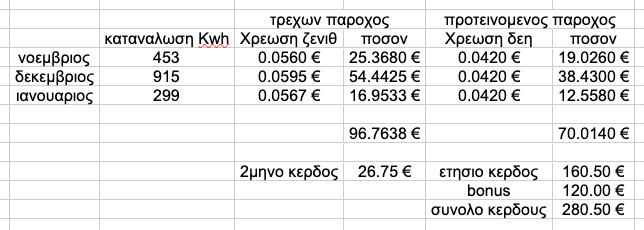 Ο Μάκης, παλιός φίλος, μας εστειλε τους τρεις τελευταίους λογαριασμούς του για ρεύμα και αέριο. Στο ρεύμα είχε ρήτρα αποχώρησης, οποτε δεν του προτείναμε κάτι αλλά στο αέριο κάτι μπορούσε να γίνει..